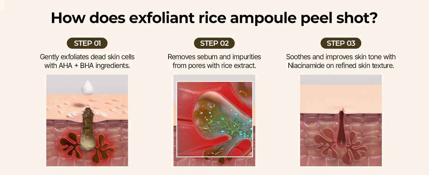 The Dr. Melaxin Rice Peel Shot combines gentle exfoliation with deep hydration and brightening care. It features PENTA-RICE™, a blend of rice water extract and Pentavitin®, to smooth away dead skin cells, balance oil production, and lock in lasting moisture. Chemical exfoliants like AHA, BHA, and PHA (gluconolactone) refine texture, clear pores, and support healthy skin renewal. Meanwhile, niacinamide and arbutin work to brighten and even out skin tone, while hyaluronic acid and glycerin provide essential hydration. To round it out, soothing botanical extracts add antioxidant protection and calm the skin. Altogether, this ampoule is designed to leave the complexion smoother, clearer, and more radiant after each use.
