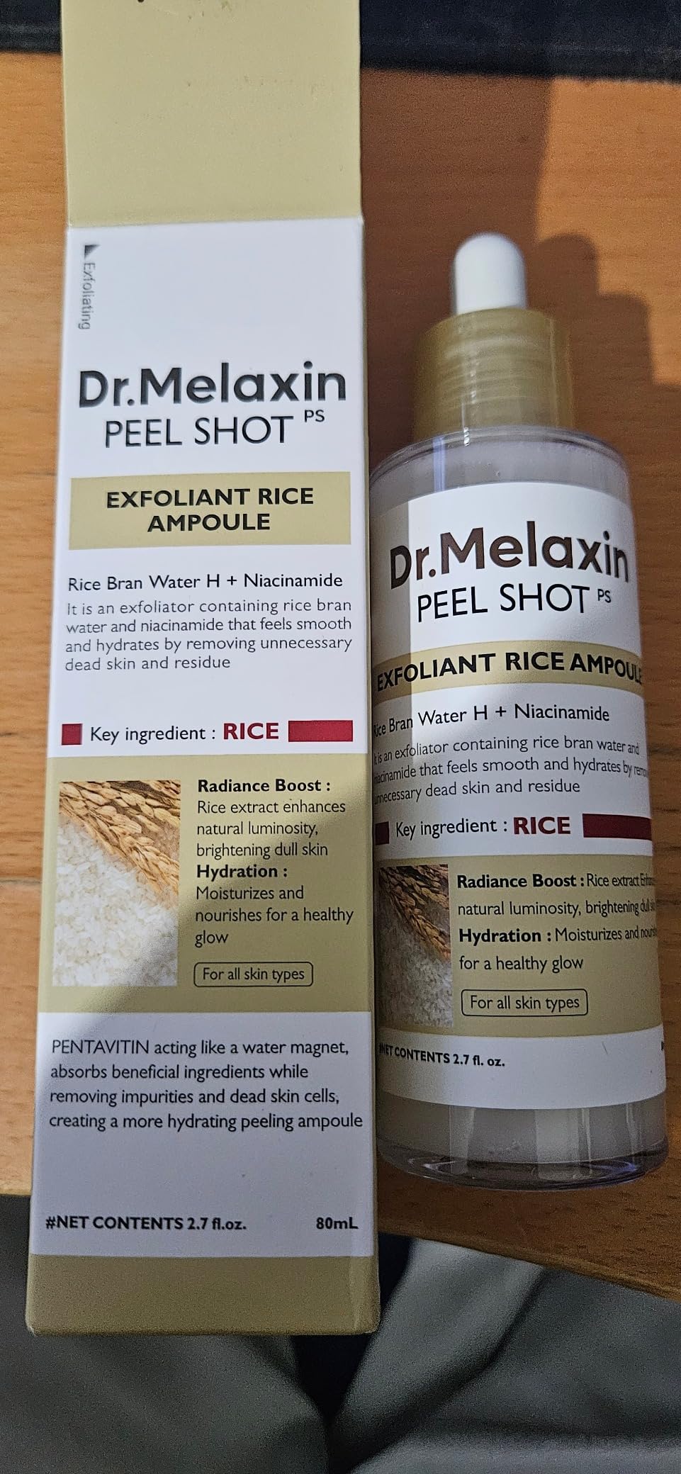 The Dr. Melaxin Rice Peel Shot combines gentle exfoliation with deep hydration and brightening care. It features PENTA-RICE™, a blend of rice water extract and Pentavitin®, to smooth away dead skin cells, balance oil production, and lock in lasting moisture. Chemical exfoliants like AHA, BHA, and PHA (gluconolactone) refine texture, clear pores, and support healthy skin renewal. Meanwhile, niacinamide and arbutin work to brighten and even out skin tone, while hyaluronic acid and glycerin provide essential hydration. To round it out, soothing botanical extracts add antioxidant protection and calm the skin. Altogether, this ampoule is designed to leave the complexion smoother, clearer, and more radiant after each use.